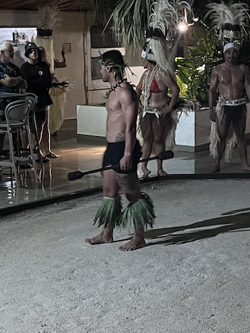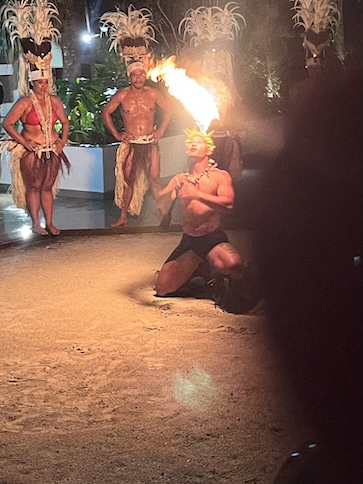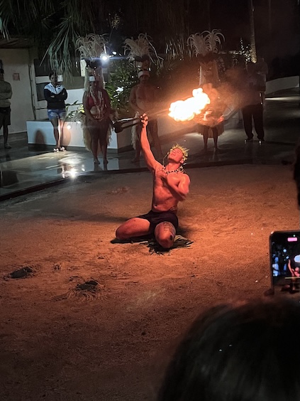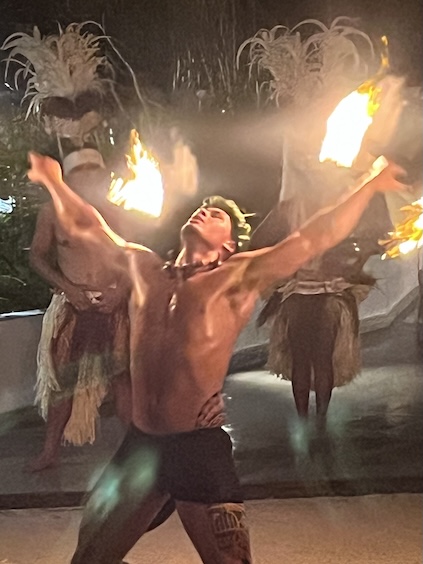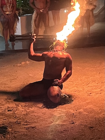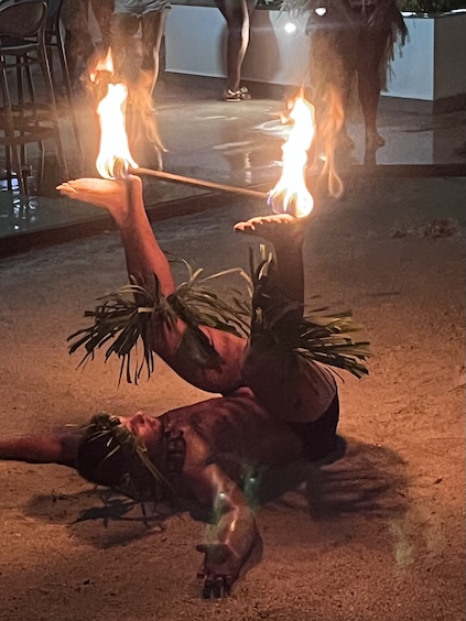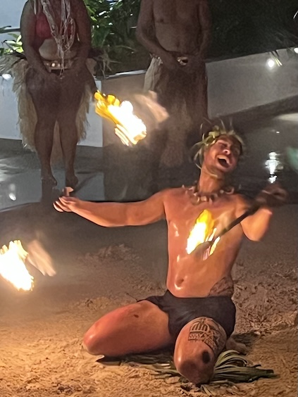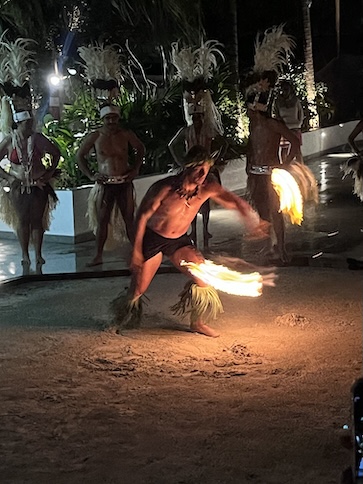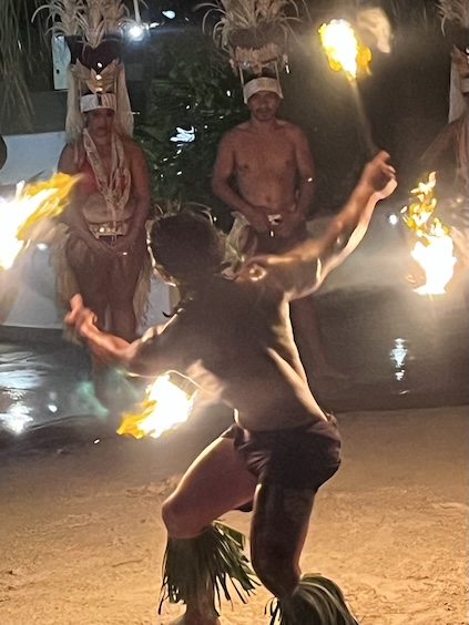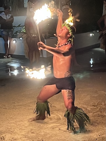 The Bora Bora Fire Dancer This male dancer was an artist with the flaming batons! He performed alone for at least 15 minutes, energetically dancing and twirling a flaming baton, first a single, then a double. "Yes, to show how pretty he was!", Conni exclaimed, as she chose this photo to post. So, here's the pretty dancer. He asked for a light from a smoker in the audience, and off he went. The dance troop circled him as he rose to his tiptoes and sank to his knees, all the while, twirling the baton. The darkness made it quite effective. I'm unsure of the flaming fuel source, but the dancer was able to smear enough of it on the ground to create a trail of flames. A nice action shot of his twirling prowess. Yeah, pretty neat trick. Still on his back in the sand, he was creative about his twirling. At the half-way time, he switched to two batons. Yes, he placed the flaming batons on his tongue, too. His aerial twirls were my favorite, as he's doing here. He was deft at hendling the batons, and I'm sure that it required some concentration. His troop watched his as closely as the audience, and it's obvous that they're impressed, too. As he ends his show, he's shining in sweat and probably tired from the attention he paid to those batons. My favorite photo of the set. He's a true showman and relishes his performance. Good for him.