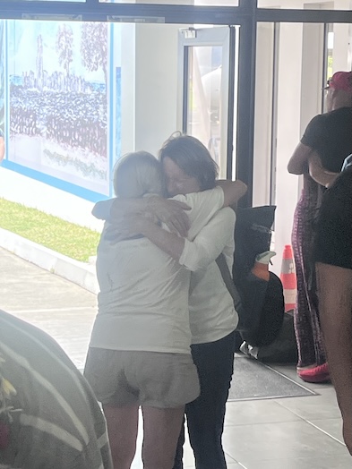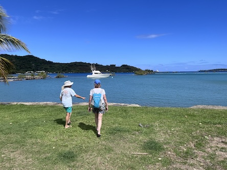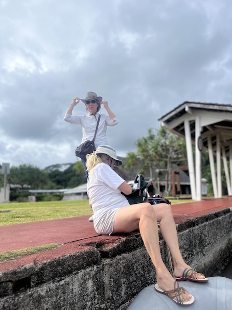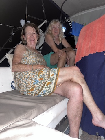 Lindsey Arrives and We Buy Pearls We have been preparing for our friend Lindsey to arrive for years, it seems. Her flight arrived on Raiatea on time and out she popped! We spent our night in Apooiti, then motored to Apu where we visited a pearl form on Taha'a. We visited our wonderful Haamene Bay, dined at Taha'a MaiTai, then moved on to Tapuamu for a rhum fix. Conni brushes her wet hair after emerging from the Apooiti showers. We'll hop into our dinghy and motor to Wings for dinner and bed. Our dear friend, Lindsey, arrives on Raiatea! Conni ran to greet her. We fetched Lindsey by motoring up the notoriously poorly-marked channel to the airport. After her arrival, we walked to the dock and motored to Wings. I've always loved that arrival.