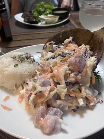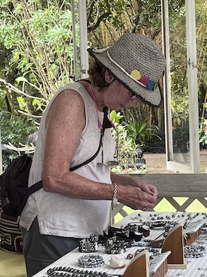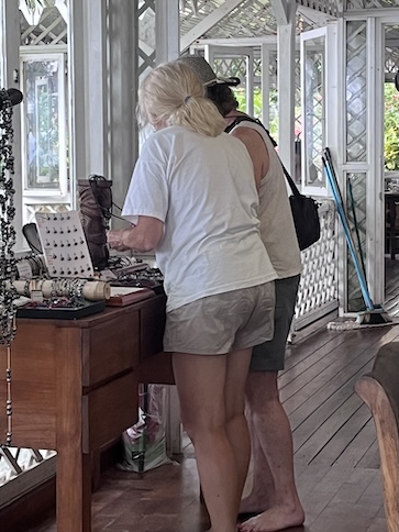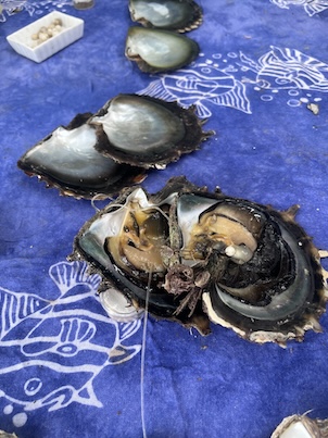 ![]() After a nap we rousted Linds and motored to the Apooiti dock and strolled to Voile d'Or restaurant for an arrival and Bill Birthday dinner. Conni, as usual, had Poisson Cru, the national dish of raw tuna "cooked" in lime juice and served with vegeggies After we departed Apooiti, we motored to Apu Bay on Taha'a. We took the opportunity to visit a successful pearl farm and learn the complex process of growing them. Here, Lovely Conni and Linds are strolling along the bank toward the farm. The magic of the Black-Lipped Oyster! Small snippets of the lip flesh color the Tahitian pearls the rich brown for which they are rightly prized. These are "baroque" pearls, so named because they are how most older pearls are shapped. These are not the perfectly round, high quality pearls, but have become highly prized in their own right. Lovely Conni and Linds conspire over a display of pearls. Linds seriously shops for pearls for gifts. Lovely Conni and Lindsey giggle into the lens.