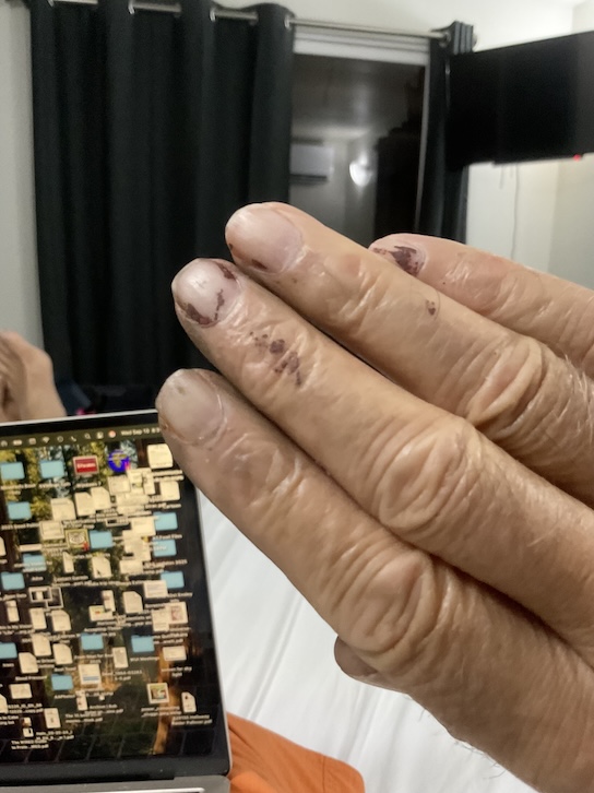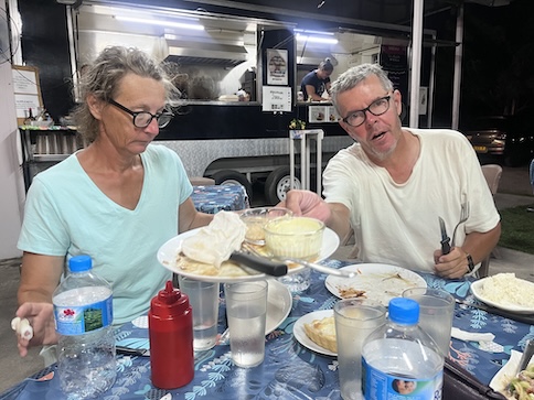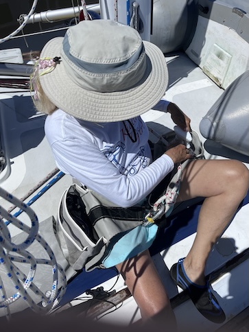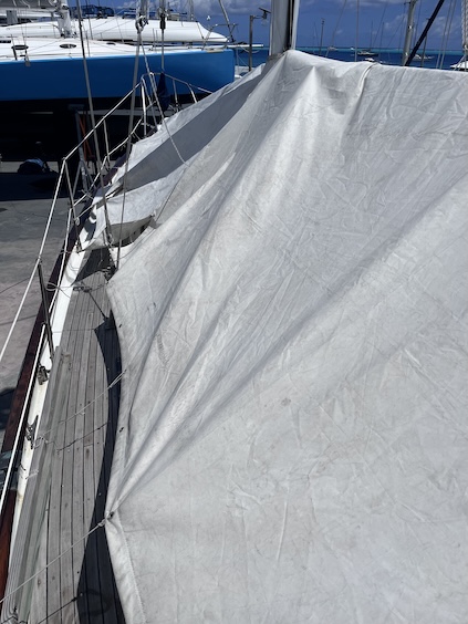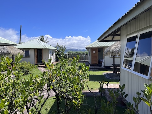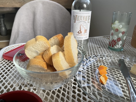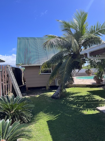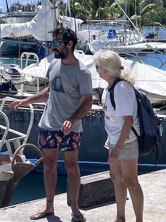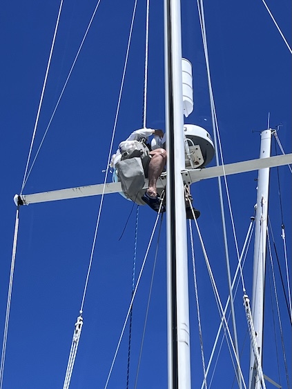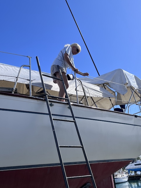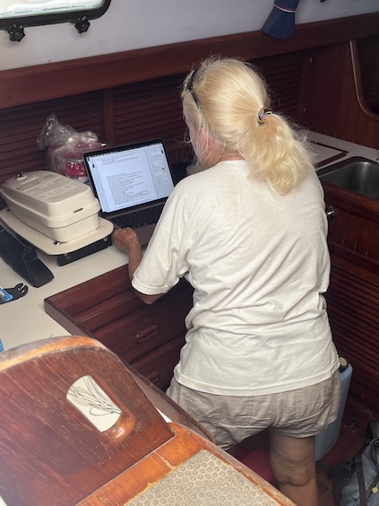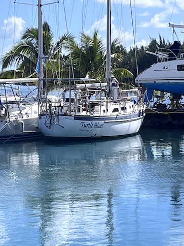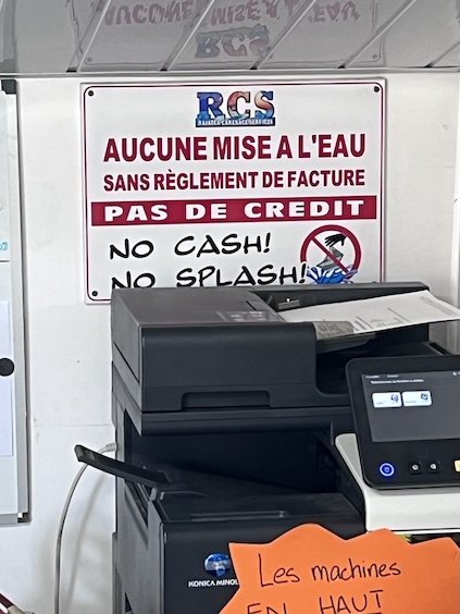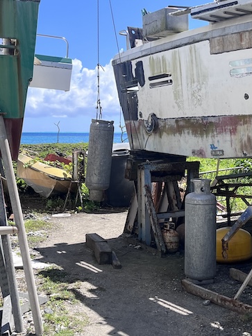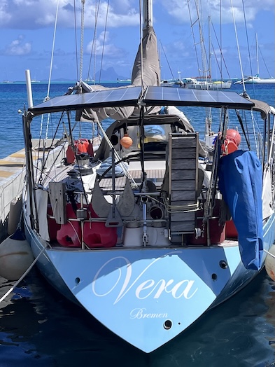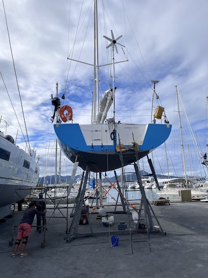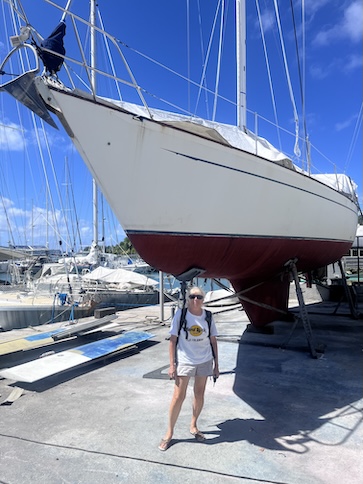 Photos from Around the Yard and Uturoa We were very busy during our last ten-day work session to prepare the boat for over-season, so there were few photos. Now and again, I'd snap one and that's what these are. We spent some time with Adva and Antoine, shown here with Conni. With their young one, they prepared for long-distance cruising. He's a naval engineer, she an author. This our bungalow, or the one that we used for both stays. It's away from the other four and has much more space and a semi-attached kitchen: it rains in the no-door. These are the old bungalows and where we usually stay. This is the butane filling site at the Carenage. Yep, they just hang the large tank upside down and allow gravity to fill the smaller tanks. It's simple but seems to work. Lovely Conni prepares for her ride up the mast to remove all the wind instruments and check fittings and such. She sits in this Bosun's Chair by the hour and I use a winch to hoist her up the mast. Lovely Conni peers up at me from ground level, as she supports the dinghy in its storage bag. On deck, I supply the muscle to hoist the 110-pound dinghy to the deck. A common site: Lovely Conni consulting her Take-down list. Conni, still on deck, as we depart the boat for the last time this season. Steep ladder, isn't it? Lovely Conni at the first spreader. Lovely Conni posing as we leave the yard for the season. You can see the cover on Wings. This is the cover that protects the boat through wind, rain, and sun. Bill has painted his nails! As a true fashion plate, it's good to know that he is always out front, innovating fashion. Here, he shows the newest fashion, red bottom painted nails! Back in the bungalow, we are enjoying a G&T with a tonic unavaible in the US and a local gin. Jumbo Top is a French open-ocean racing boat. Note that 3.5-meter-deep keel. Our German friends, Britta and Michael, are just in from cruising so not their fanciest, but they're great folks adn we enjoyed dinner with them. Ron's Roulotte, where we enjoyed several excellent meals. I couldn't get past "thon frite" or grilled tuna and fries. We've looked at that sign for a decade: No cash, no splash. It always makes us smile. This is Britta and Michael's boat, Vera, that they sailed from Germany, with stops in Antartica. Adventourous folk. This is Manu, the wood expert from the Carenage. We were aboard when Turtle Blues was launched. She's owned by our Australian friends, Reinhardt and Rianna.