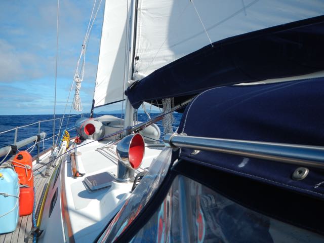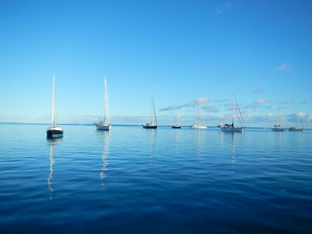 To break our long trip back West toward Raiatea, we decided to stop over in Fare, Huahine. The pass is large, well-maarked, and we had negotiated it once before. The next day's short trip of 25 nm after a good night's rest seems a good idea. Shoot, we coud see Raiatea in the distance! If we hadn't lived through similar issues, we would not have been so responsive, perhaps. In addition, we've been helped so many times. A fellow cruiser's outboard had stalled as the family group returned from shore to their boat, and Bill jumped into the dinghy and motored to help. The man (of course it was a man...) replied, "No thanks, I know this engine!" Well, OK! He did finally get it going and Conni caught Bil returning from the mooring field. With Raiatea in the background, this is the calm field of sailboats anchored near us. Sailing under double reefed main but full jib, we race toward Raiatea, visible just under the jib. Raiatea, our day's target, is 25 miles away, beyond the nearby reef. You can see the line of calm water ending and rough water beginning. Close to Raiatea, it's easy to see the remaining volcanic features.