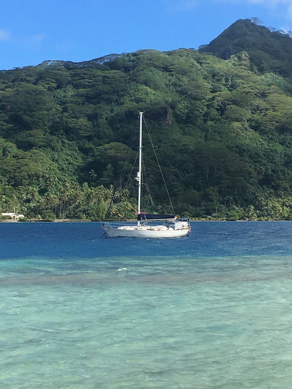 This will begin in Ha'amene Bay, home of the famous Hotel Hibiscus. We finally made it and, after motoring ashore, I snapped a photo of Wings hanging on her mooring. Note the huge color difference between shallow and deep water!