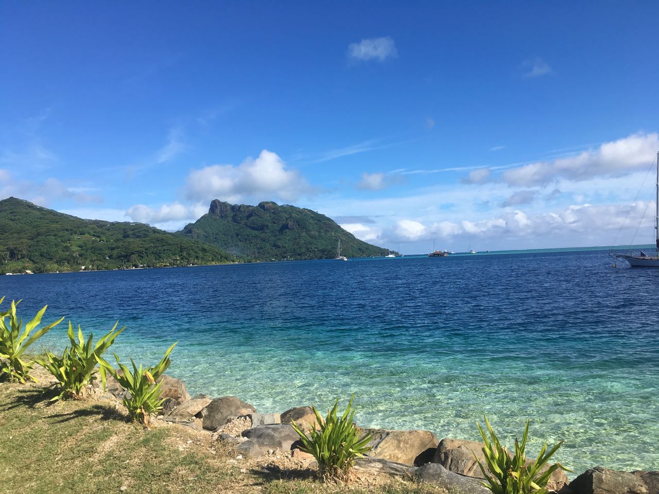 Returning to the Huahine Yacht Club, we look out at the faux-sailboat.