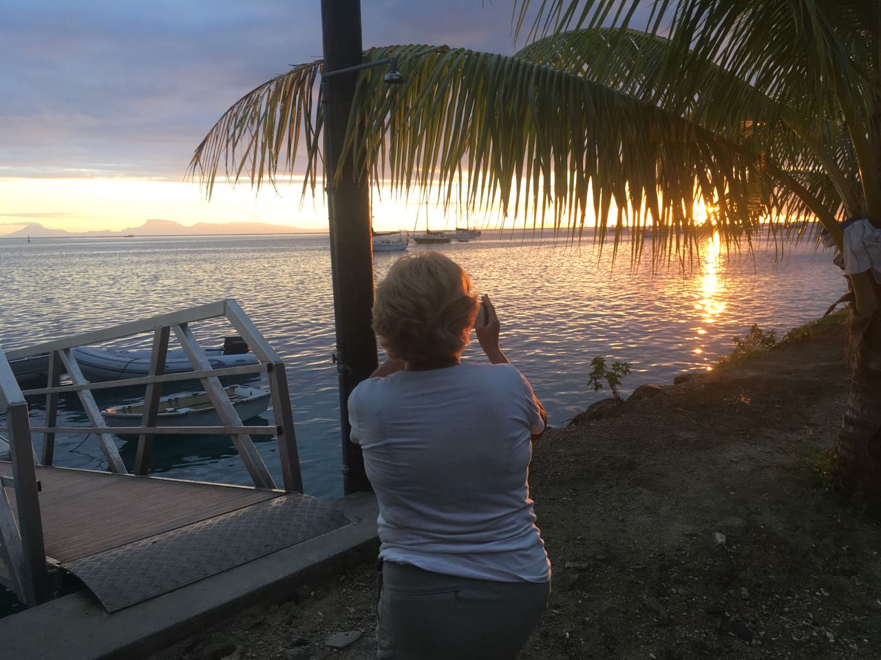 Lovely Conni snaps a photo of sunset at Fare on Huahine . With a new sign, the Huahine Yacht Club moves in further uptown. This place knows what cruisers want: Wifi, good food, laundry service, and cold drinks. They've got it covered.