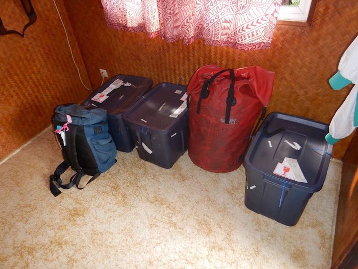 The 200-pounds of gear in our marked and secure travel boxes. My enormous red Bill Bag stands among them. Thankfully, this is the end of the line for this stuff and we'll slowly unpack to get gear to the boat. |