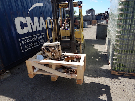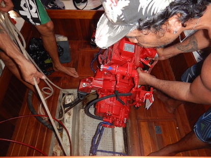 The old Nanni has been lifted with the block and tackle we fabricated here and is ready for the forklift to pull it from the boat. Ralph looks on.