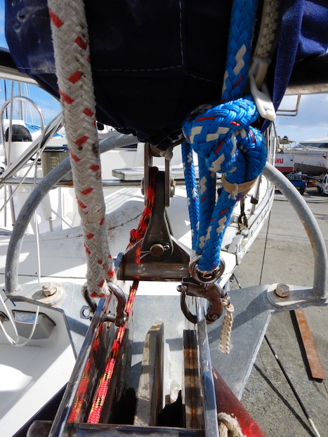 This is why we rent the bungalow! Imagine living in this mess. We were forced to do so during last year's engine change, but not here and now. Thankfully. Moving the boat requires that we remove the cable that holds the mast from falling backwards: the forestay. Normally, we use one of our halyards, ropes that raise and lower sails, to support the mast, but we removed them to prevent UV damage on the expensive equipment. The yard crew needed to move the boat, released the forestay, then couldn't reattach it! How long she went with no forestay, I have no idea, but we're fortunate that no damage occurred. Conni and I worked several hours to rig a system by which we could replace the stay, and this is it. The orange/red line goes back to a winch with which we hauled downward the "fork" (shaped like a teardrop from this angle) so that we could fit the huge pin and Cotter pin that safeguards the stay. In this package is a special, lubricated material that is used to prevent seawater from leaking around the propeller shaft as it protrudes from the hull. It's called "stuffing" and must be replaced regularly. It's moldy! I would not thought it possible, but here it is and I had to dispose of it.