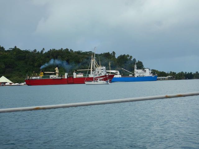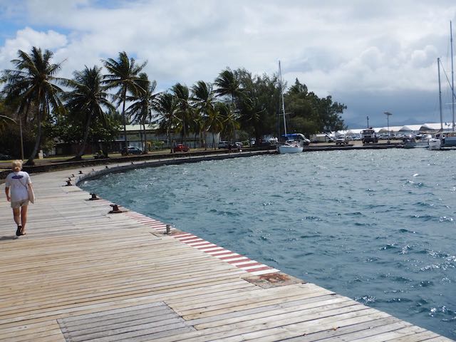 Wings tied to the city dock in Uturoa. Note the blowing palm trees and surf in the marina! We're tied there as we mentioned in our blog because we were having engine problems.