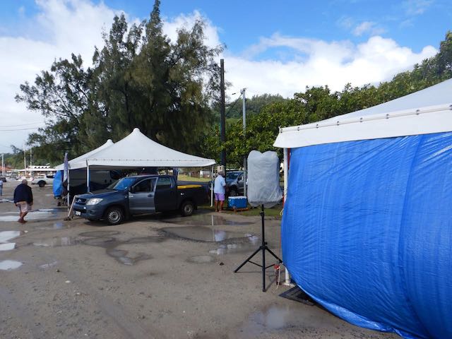 There are no car dealerships here on Raiatea, so a few times a year, dealers in Papeete bring in automobiles to sell. The also bring bankers and all are ready to deal. There is some attempt made to provide some shelter for the buyers and tire kickers, but the visiting Mara'amu, the hot, wet, violent storm system, has made the place a mess.