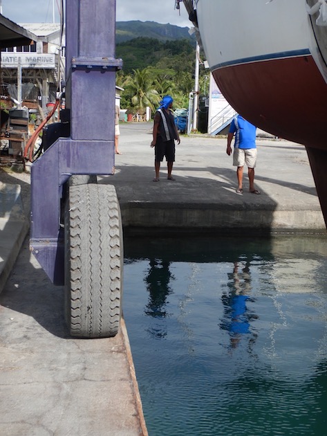 Wings in the TraveLift slings is moving toward the slip and her life as a boat again. Conni is at left, watching.