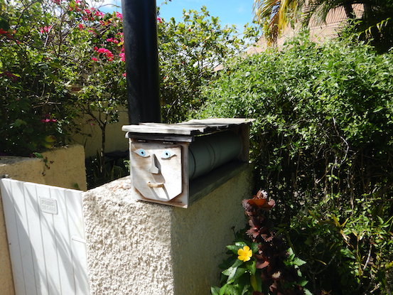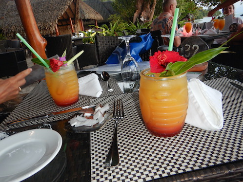 Avea Bay Avea Bay is beautiful and lies at the southern end of Huahine. It's difficult to negotiate the many turns and shallows to enter the bay, and it scared us badly on our first trip many years ago. Even this trip kept my attention, since we traveled for a 1/2 nm through water fewer than 17 feet deep. The Relais Mahana resort is here, along with another fine restaurant: this is my second birthday here! We took a long stroll along the belt road on Tuesday and came across this flowering bush. We have no idea what it is, a common problem, but it's beautiful with white flowers and the orange berries. Lovely Conni strolls down the belt road, enjoying the green beauty that is Huahine. Some local artist decorated this wall with patterns of seashells. I thought that it was quite fetching. Yep, that's a large catamaran up on land. We saw its stern list Ventura, California as its hailing port, but more than that, we don't know. The biggest mystery to me is how they got it there, and of course, why. A puckishly clever decoration on a bread delivery box We had motored to the Mahana resort to shower and enjoy a meal on my birthday. These are the beautifully-decorated MaiTais that we enjoyed during Happy Hour. My meal was this lovely chunk of grilled swordfish with a Nouilly Prat reduction. Wow! Lovely Conni had this fine tuna in a garlic white sauce. Look at that odd tree that's growing behind her. It's almost strangling the larger one. Dessert was this eclair with homemade caramel sauce and all those cool white chocolate fins. The dessert was named a "pirogue" on the menu. The cup held the smoothest vanilla ice cream we've ever consumed. The Birthday Boy himself. It was quite an evening. The next day, we motored several miles through