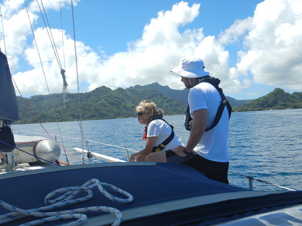Bora Bora Continued Bora Bora is a gorgeous island. The lagoon waters are lovely and the islanders friendly and kind. CoVid, and the aftermath of the havoc that it's wrecked on the local population, has prohibited our visits to shore other than grocery purchasing, so we've done what we could. Still, there's no denying that we're in a beautiful place! Yes it rains here! That's an older sailboat behind us and it's apparent how hard it's raining. This is our guest, Ian, at the helm. We're offshore since he's wearing a life jacket, mandatory for everyone when we're offshore. We've just entered Hurepiti Pass, as the surf shows, and we're heading for the Taha'a lagoon. That's Bora Bora in the background, with its unique silhouette. Lovely Conni and Ian contemplate. We're inside the Taha'a lagoon, heading for Tapuamu. Conni and Ian are still in their life jackets. As we motored up the Taha'a lagoon, I snapped this photo of a local and his small boat with Bora Bora in the background. A Tapuamu sunset seen from our cockpit. As sun continued to set, I snapped this photo as we enjoyed a cooler evening in the cockpit. What incredible colors! Before departing Tapuamu, Ian and I were on the foredeck to slip our mooring. Ian has taken extraordinary measures to reduce his sun exposure. We departed Tapuamu and motored across the lagoon to investigate the posh resort on this motu. These are the classic, "over-water bungalows" that are the hallmark of Polynesian resorts. Bora Bora is in sight. As we moved north, then east over the top of Taha'a, we negotiated a series of very narrow and complex passes through coral and sand bars. This red channel marker shows the location of very shallow water, as its green color at the right of the marker shows. Ian at the helm. He learned quickly how to