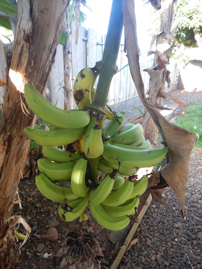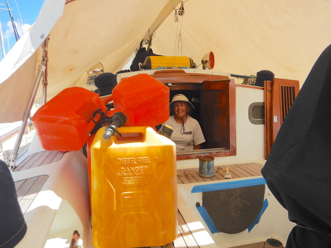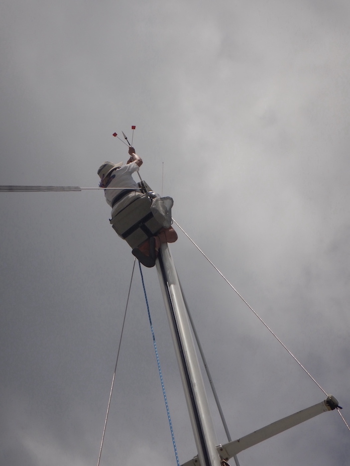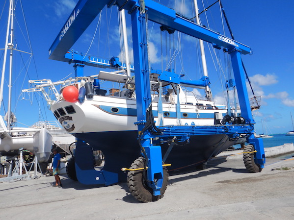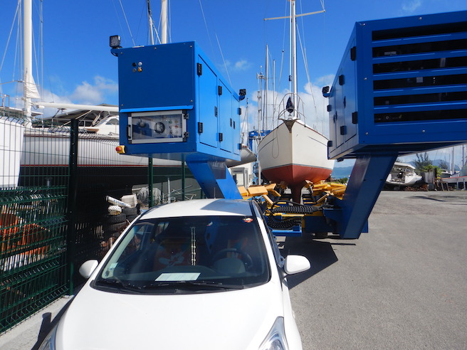 Final Days at the Yard We've come to the end of the 2021 season here in French Polynesia. We had challenges, to be sure, but many peaceful and fun times, too. Neither of us regrets our decision to travel to Wings. We had a great visitor, Ian, and the boat is in better condition than when we arrived. We snapped these photos as we were completing the decommissioning process, but had no opportunity to post them. Our rented Fiat Panda is parked in front of Wings in her cradle. We had power but had just been pulled from the water and had hardly begun our task of decommissioning. This is a view from Wings' bow, looking toward the wounded motor yacht we had described in prior blogs and photos. The old ferry, Aremiti, was the predecessor of the ferries that we've shown you through the years These are the bananas that Conni rescued from the local chickens. This is a still life with fruit, taken in our little bungalow kitchen. It's primitive in the extreme so it's a wonder that Conni has whipped up so many great meals here. Another still life, this one of a typical afternoon cocktail hour, this one with the Wine of the Summer, a Natura Rosé. This is a great shot of Lovely Conni ascending the mast to remove instruments and check everything for the season layover. With clouds over head, Conni works on masthead chores. The enlargement of our back stay is our SSB radio antenna. Meanwhile, below decks, gear from outside is being stored, making living aboard very difficult. Those are our solar panels on the right, padded by seat cushions. A possible holiday card photo here. We're standing just off the belt roadway at Apoiti Bay, with the rental catamarans at anchor behind us. This is the huge new hydraulic lift towering