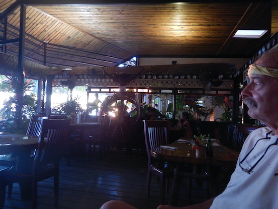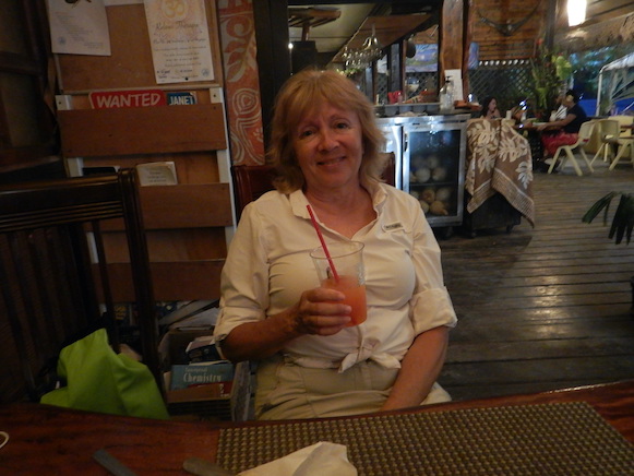 Anchored in Fare Fare is the main village of Huahine, one of our four local islands and one of our favorites. It's located 25nm southeast of Raiatea and is only partially prepared for tourists, maintaining a great deal of its natural island way of life. This is Aremiti 5, as you can see. She's a fast island passenger ferry that's both fast and strong enough to bring passengers from Tahiti, 100nm away, to Bora Bora. She's a catamaran so draws little water and with twin screws, she is exceptionally manuverable. We strolled around town on Saturday, our first day off the boat since leaving Raiatea. This is a view southeast across Huahine's bay. I do like this photo! I snapped it from our outside table at the Huahine Yacht Club as we were enjoying a beer. Wings is directly under the palm frond, and our dinghy, tied at the dinghy dock, is the one in sight at bottom. Raiatea, our home island, is in the background. That beautiful surf is highly rated by surfers, we read, and has been pounding that coral reef for the past several million years. Later that same day, we returned to the Yacht Club for happy hour and dinner. The MaiTais at our table are the result of Happy Hour! Lovely, and I do mean lovely, Conni is preparing to order. We were photo-bombed by this derelict sailor, unfortunately, but it's nice to see the lovely interior of a real Tiki Lounge: the Huahine Yacht Club. Awaiting dinner, Lovely Conni enjoys a cool MaiTai made with local and fresh juice. The bar section is behind her. Here's a nice photo of our dinner: my Marlin steak and Conni's Poisson Cru, the country's national dish, made of tuna (usually) cured in lime and coconut juice. |
