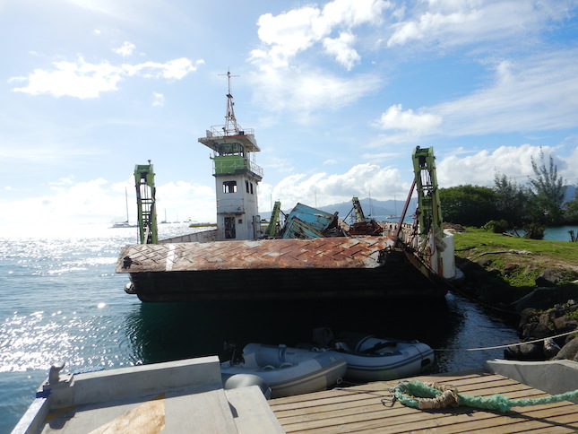 Day 1 at Fare, Huahine Fare is the main village on Huahine, and Huahine is a mere 25 nm from Raiatea. We arrived yesterday, had a nice evening, and awakened this morning to a day of chores. Huahine is one of our favorite islands, and it's easy to see why. One always asks permission for a photo, and she agreed. This is Hinamoe, the young woman who's been assigned to move boats in Dominque's absence. This is Wings in the new TraveLift slings. This wreck is an old ferry that used to run among various islands, but has long since ceased to be useful. For reasons that I don't understand, Dominque left this eyesore and navigational hazard just behind the launch/lift slip where everyone must avoid it's rusty sides. Departing in a breeze is not made easier by avoiding this POS. And...Wings is a boat again! I mentioned in the blog that the bilge hose had been chewed to bits by colliding with the propeller shaft coupling. Here's the result. Note the number of stainless ste4el wires that were shredded. This is a fine view of a neighboring boat, German we think. There are 2 couples here, enjoying a few beers together. Sundown from Fare on Huahine. Beautifuil. Lovely Conni enjoying a cocktail. Bill, enjoying a sundowner. |