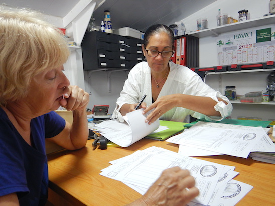 She's a Boat! It's been many weeks, but we're finally in the water. Here are a few photos that I've gathered to show what we've been doing. We drove to dinner a week ago, while still living in the bungalow and I snapped this photo of a crescent moon in a lovely South Pacific sunset. This is our favorite roulotte, or food wagon. It's not mobile anymore but the seating and food are still superb. The father/griller is in the black shirt at right. The flash on our little camera did not do justice to lovely Conni, but it shows the mountain of fries and nice steak of our meals. We both enjoyed steak frite. This beautiful tour boat was in for some work and I snapped the photo. She was built in this yard. Note the tiki on her bow. Striding into a muddy yard, Conni and I depart the boat so that the trailer lift at right can move Wings Wings is the smaller red-bottomed boat. At left is a 50-ft Amel. Boat on trailer, trailer on forklift...never seen it before. I suppose that it's easier than using a truck to put it where you want it. As we pay our bill, Viarea, the Carenage accountant piles on the pages of charges. Dominique, the boss, looks on as Wings is handed from the trailer to the huge TraveLift. The blue and yellow trailer is being lowered as Wings is moved to the TraveLift for splashing. To prevent paint and grease from the slings being ground into the fiberglass of her hull, this worker uses plastic tubes strung along the lift straps of the TraveLift. This is a new process, but I've scrubbed paint and ground-in grease too many times not to be glad. Here, Wings hangs in the TraveLift slings and is