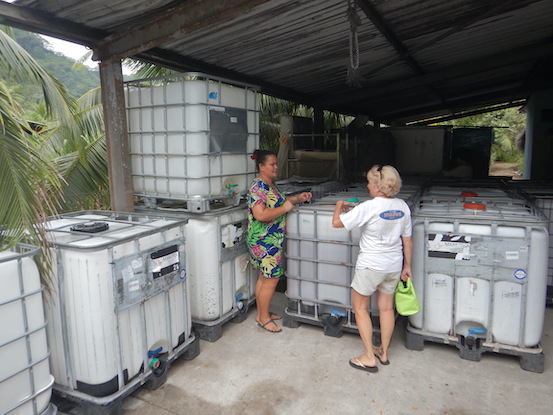 Tapuamu and PariPari On this second trial to stay in Tapuamu, we found the place almost empty, rather than the 14 boats that filled the small bay the previous trip here. Relief! Here are some photos of our time in Tapuamu. This is Taporo VI, the red supply vessel that re-stocks this area. There's a blue vessel as well. With Taporo just offloading, we knew that we'd have a good chance of finding the groceries that we needed. Cool Whip? Ben and Jerry's ice cream? Whatever. Here's one of the coolers that hold the frozen products that locals want to buy. This is the Pari Pari distillery, producers of the finest rhum agricole we know. Rhum agricole is made with cane syrup rather than molasses, from which most rums are made. It's a tiny distillery but by dint of effort and talent, they've become very well known. Pari Pari is dedicated to making rhum the traditional way, using an almost extinct ancient sugar cane variety named, Old Tahiti. They pay the local farmers top dollar (well, top Franc) for growing it, and it's all grown without pesticides or fertilizer: totally organically. Step one is to crush the incoming cane and collect the juice. This motorized conveyor belt drags the crushed cane to a pile that's then distributed to the growers to use as fertilizer. The owner seems dedicated to sustainable agriculture and hires only locals. Here are the barrels used to age the distilled rhum. These plastic drums hold the raw sugar cane juice during fermentation. The juice ferments to 8-10 proof in only 7-10 days. It's open air ferment with no added yeast! One can't get more traditional than that. The guide is explaining the process to Conni. This is a photo taken down into the cane juice as it froths with CO2 bubbles from fermentation. It doesn't look appetizing now, but it makes great rhum! Pari Pari has been so successful that silver rhum, with minimum aging, is all that they had to sell! The darker rhum at right is a passion fruit rhum which has passion fruit syrup added. The silver is available in both 40 and 50 proof. The 40-proof that we bought is simply superb. It's no wonder that they've become famous. They've won gold medals in several international competitions and sell their cane juice to other producers so that the local farmers always have a market. We appreciate and support the owner's attitude. They sell other products based on local materials, including some excellent coconut-based skin creams and insect repellent. They also sell many products made by locals. This is part of the open air workroom.