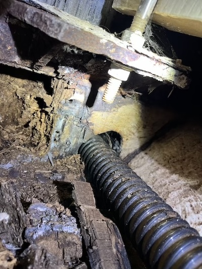 This is so wretched that I almost chose not to post it. This is the rotten mast base. As you can see, there's little remaining of solid wood after a lot of water leaked down the mast. We did try, constantly, but never succeded, as this mess bears witness. All of it was removed.