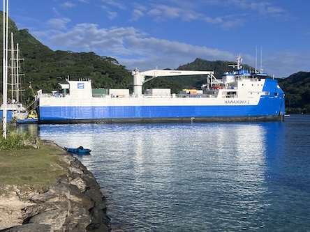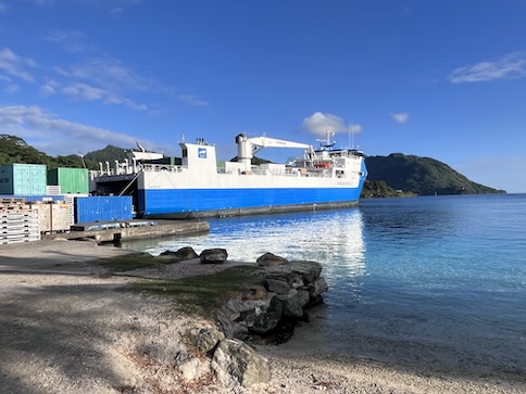 As you can see, the ramp is large enough for almost any vehicle or cargo load. The large tanks at lower left are gasoline carriers to supply the few service stations on Huahine. There is a second Big Blue, a Big Red, and the Apetahi Express, a passenger ferry. All operate among the Leeward Islands of the Society Islands, to and from Papeete. Each island receives several visits by each vessel each week.