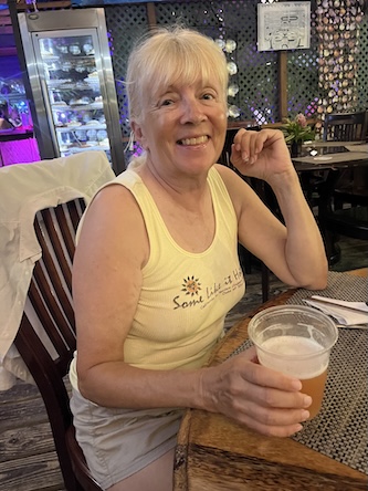 After working for an hour to get the outboard running, we motored back to Fare for a promised and anticipated dinner at the Huahine Yacht Club. It was rocking! Here, Lovely Conni sips a MaiTai. What's for dinner? BURGERS AND FRIES!