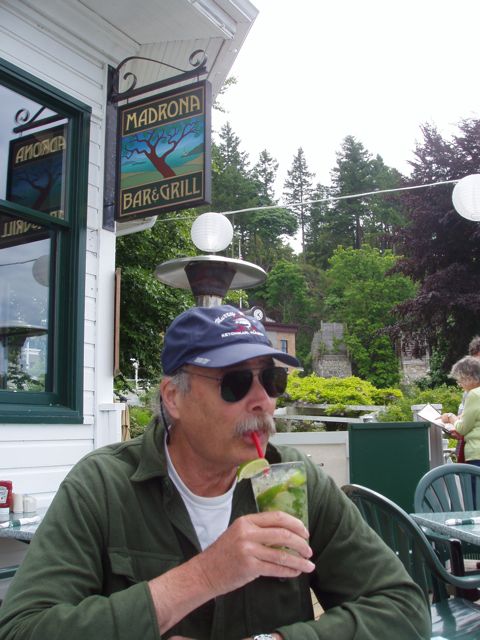 Bill enjoying a fine mojito on the deck of the famous Madrona Bar & Grill at Roche Harbor.