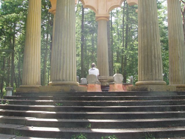 The mausoleum is situated on high ground in the forest overlooking Roche Harbor. Bill sits in one of the chairs contemplating something or other.