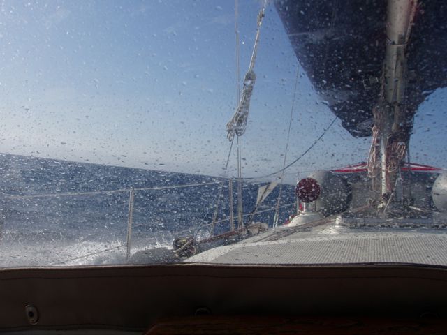 Our flags through a salty window. I was lying in the cockpit, looking up at the fluttering flags and snapped this photo. The flags are a Mexican courtesy flag, our Alaskan flag, and the Baja-Haha flag. The photo could also be called, Billy's World.
