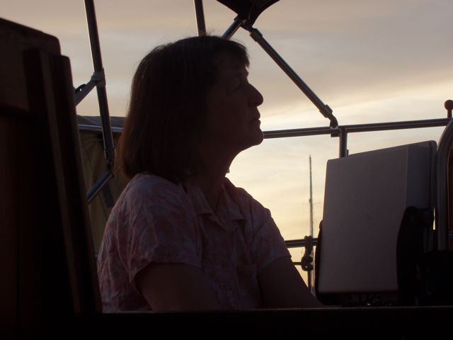 Nancy considers the sea at sunset on the night before we arrive in Bahia Santa Maria.