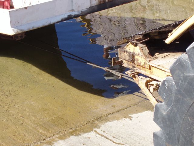 She's coming out of the water. The hydraulically-operated arm can be seen at left. This trailer had three per side.
