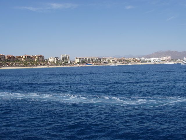Another photo of leaving the Cabo harbor. At center left is Pedregal Hill, home of the movie stars.