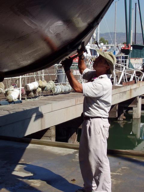 Bill Melbostad, our surveyor, taps on the hull to find delamination damage. A sharp "crack" means that the hull is solid and undamaged.