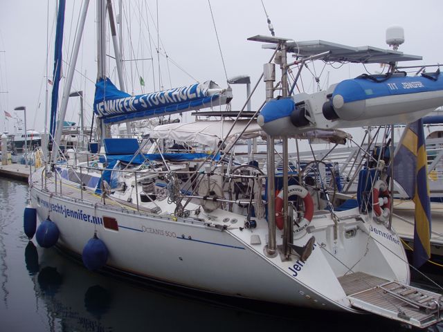 An Alberg 34, a classic sailboat. The owner is a mariner who does deliveries world wide.