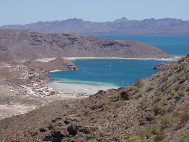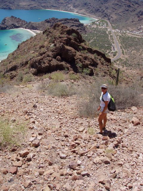 We Explore Bahia Coyote By Foot There was little reason to leave. We had ascertained that moving further south would not provide the good anchorage that we had earned, and the terrain around us was spectacular. Why move? We followed the recommendations of the guidebook and hiked to the top of a local mountain. Although we did not find the promised Pre-Spanish stone markings, we did find "bell rocks" and a lovely view.