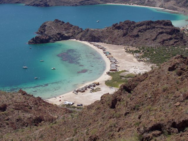 Playa El Burro with Bertha's in the foreground. What beautifully colored water! The small structures are rental palapas. The previous day, we hiked over the small peninsula that separats the beaches by walking to the far end of the Playa El Burro and climbing over the rock. This side was easy but the other side was challenging!
