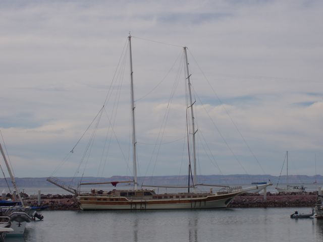 Near us is this lovely schooner against the breakwater. She's less lovely when you see the bent foremast. Yep, it's broken midway between the first and second spreader.