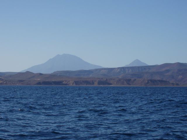 Two of the three "Tres Virgines", a set of stratovolcanos (tall, conical volcanos built up by many layers (strata) of hardened lava, tephra, pumice, and volcanic ash) that line the Baja coast. There are enormous gypsum mines based here.