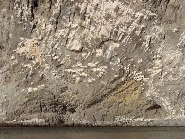 All of the Sea of Cortez is volcanic, and nothing shows this more than the amazing shapes of basalt that form these columnar shapes here. Of course, bird doodoo helps delineate the shapes: what geology lovers! Isla Partida, south side.