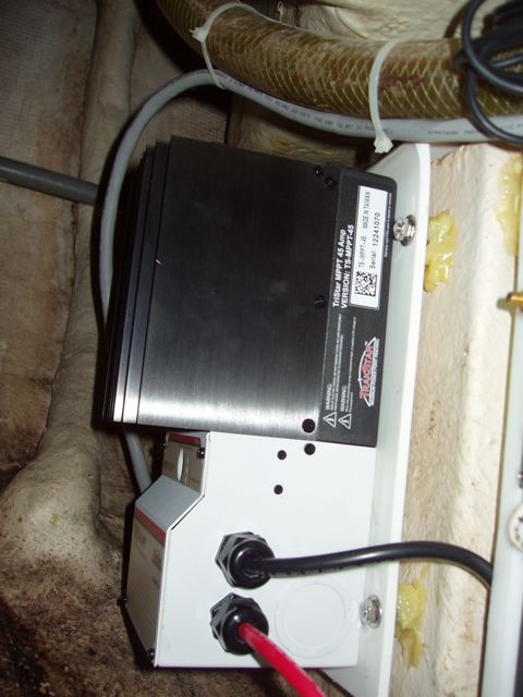 The NEW solar charge controller mounted in the "man cave" below the cockpit. I fabricated the white plastic mount by heating the plastic with a propane bottle and torch head and bent the hot plastic with a lip for support of the weight. I epoxied four bolts onto the vertical surface. I could bolt the mount and device onto this previously unusable location. The controller constantly monitors the solar output and modifies it for maximum charge to the batteries. The red and black cables lead directly to the main bus bars where the power can go to batteries or appliances. The large gray wire leads to and penetrates the transom with a waterproof "cable gland", then to the two solar panels.