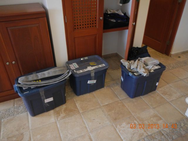Our three Rubbermaid "Blue Boxes" full of gear fill some floor space in the resort's room. The odd items on the top of the left-hand box are lengths of used fire hose used for chafe protection on dock lines. It's an old trick. We found on-line a 50-ft roll of the used 1-1/2 inch hose and Conni's dad and I cut some of it to length. The Blue Boxes have served us extremely well, protecting and transporting gear to ports from Alaska to Mexico, on taxis, buses, carts, and aircraft.