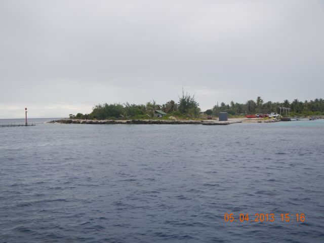 Manihi We made a somewhat emergency stop in Manihi. We had wanted to see the place, but our energy problems (failure of the engine alternator regulator) had severely restricted our ability to make energy and we needed to get to Rangiroa for fuel. We tried to motor into the inner lagoon when we arrived and made to within a few hundred feet, but the current of the out-going tide was just too strong and we had to carefully turn the boat around and get her out. We didn't want to run the engine with so little fuel aboard, so we just drifted. A generous local motored out and offered to haul us in to the dock. We accepted. What a riot of a place! A TERRIBLE squall popped as we were taking on fuel and put a halt to the process. The process, by the way, was buying diesel fuel from individuals who were willing to sell to us from their personal stocks. We paid $12/gallon for the diesel, quite a mark-up. It arrived in a 20 or 32 L jugs that we had to empty and return. We siphoned into the tanks with an old fuel hose. The 20 L jug was delivered on a bicycle! We made friends by offering candy and school supplies and that helped smooth the way. During the downpour, the boat was being slammed against a large rubber fender that prevented damage but not scuff marks. We sacrificed two of our inflatable fenders to stop the marking, but it worked.