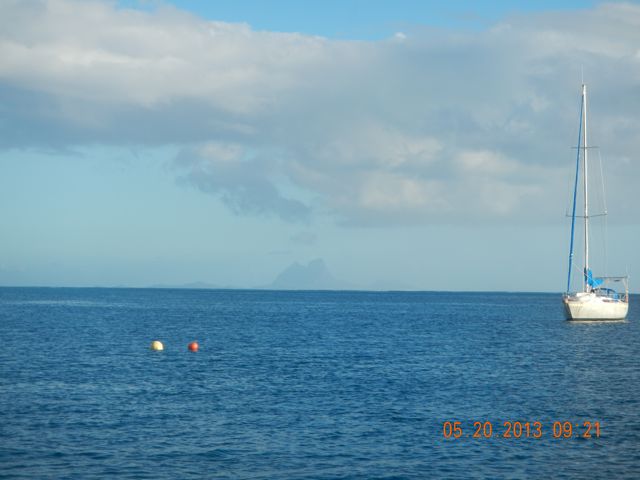 Bora Bora visible from astern of us. A unused mooring lies between.