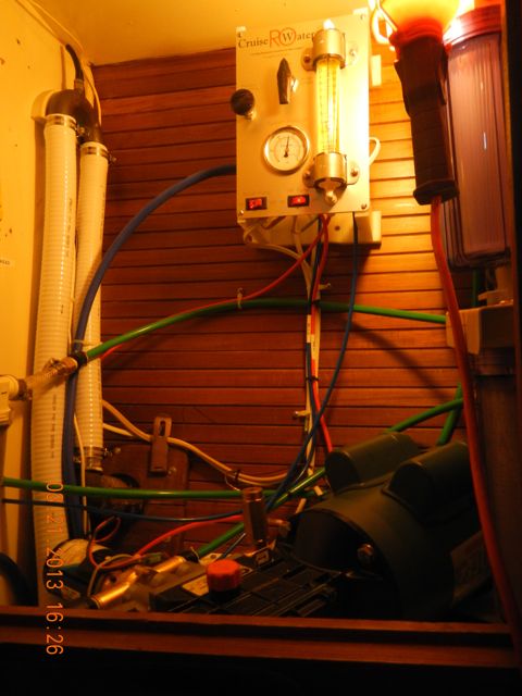 Our wonderful water maker (desalinator) cranking away, making our 24 gallons per hour. The rotometer on top measures freshwater flow through the system.