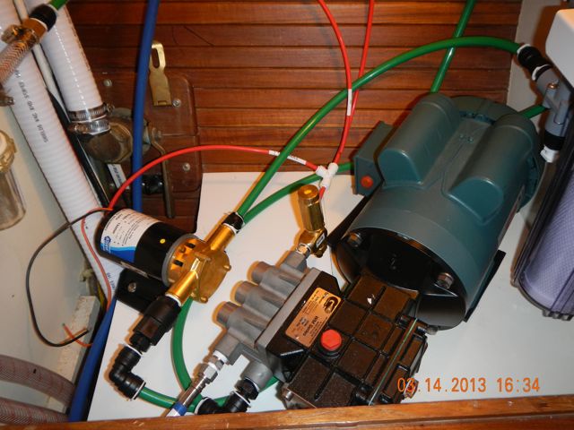 It's easy to see the layout of things. Red hose carries brine to the through-hull that we installed. Green hose is 1/2-inch hose for input seawater into the system. You can see the huge electric motor and the large pump at right. This motor is 120 VAC, so the device must be operated when our Honda generator is running. We can charge batteries, charge laptops and iPads, and make water. It will be a very cool system....when I get it running!