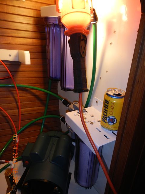 No, the Pacifico is NOT why it's taken me so long to install this thing! The two filters (20 micron, 5 micron) at top treat sea water after it comes from the tiny strainer. The lower charcoal filter is used to remove any chlorine from tank water and is shunted into the system when we backflush the system after use. Obviously, it's a great beer caddy, too.