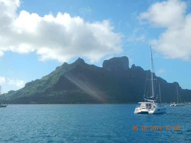 The mooring field in front of Bloody Mary's bar with the mighty Bora Bora volcanic plug visible in the background.