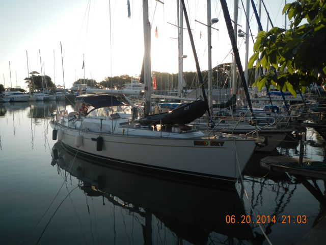 Conni posing in front of our cabin. While hot and muggy outside, inside we enjoyed air conditioning, running hot water, and a small kitchen for creating cocktails. Conni's cocktail and Advil got us through our decommissioning. The mast behind the cabin is Wings'.