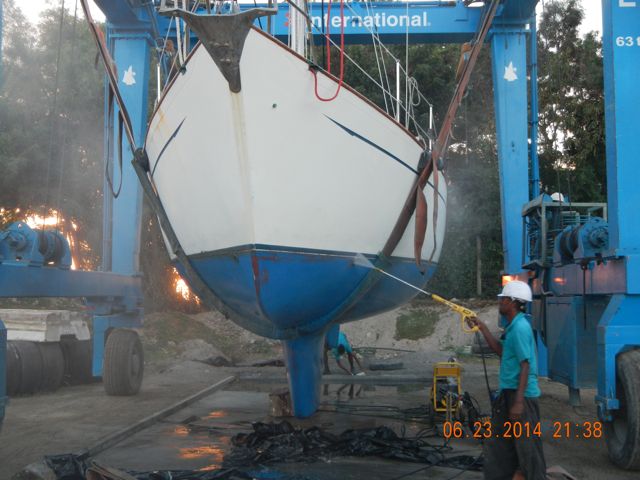 While still in the TraveLift slings, the crew gives the boat a power wash, using a high-pressure water system. The hull is cleaned of all soft growth and some hard growth and the effluent is caught and filtered in the concrete containment basin below the boat.