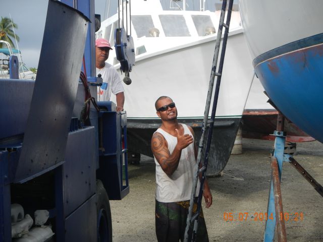Nicholas, our Raiatea Carenage mechanic, signals all well as we prepare Wings for lifting into the water. Conni thinks he's cute.