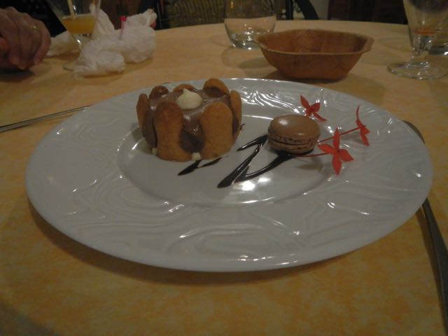 Bill's meal was pork with coriander and lime juice. The little gratin was potatoes, carrots, and lots of Herb de Provence. Bruno the chef told us that the preparation was his take on a typical Thai dish.