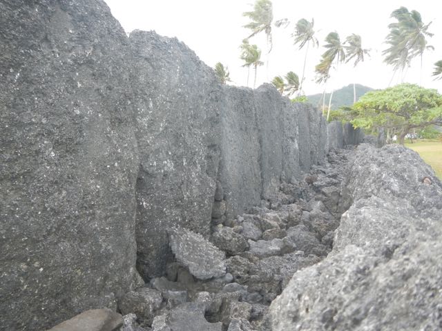 This is coquina, the material from which the marae's are constructed. It's exactly what it appears to be: sedimentary rock made of sand, coral, and shells.